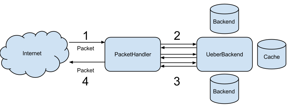 Packets come in from the Internet and get processed by our PacketHandler class. This class has all the logic on best zone selection, CNAMEs, wildcards, delegations, DNSSEC metadata etc. And to figure this all out, it sends many questions to the UeberBackend. The UeberBackend is subsequently responsible for distributing the queries over the multiple possible configured backends. In addition, it hosts a cache which optionally remembers answers (or lack thereof) a backend provided previously.