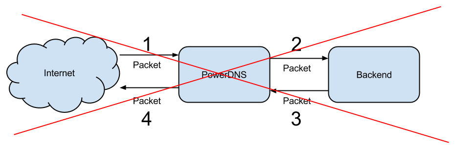 In this model, packets from the internet get handed over to a backend, and the backend drafts an answer packet for PowerDNS to send out. We do have functionality that does that, more about which later, but backends are not it. Backends get DNS queries and return data, or perhaps none if there isn’t any.